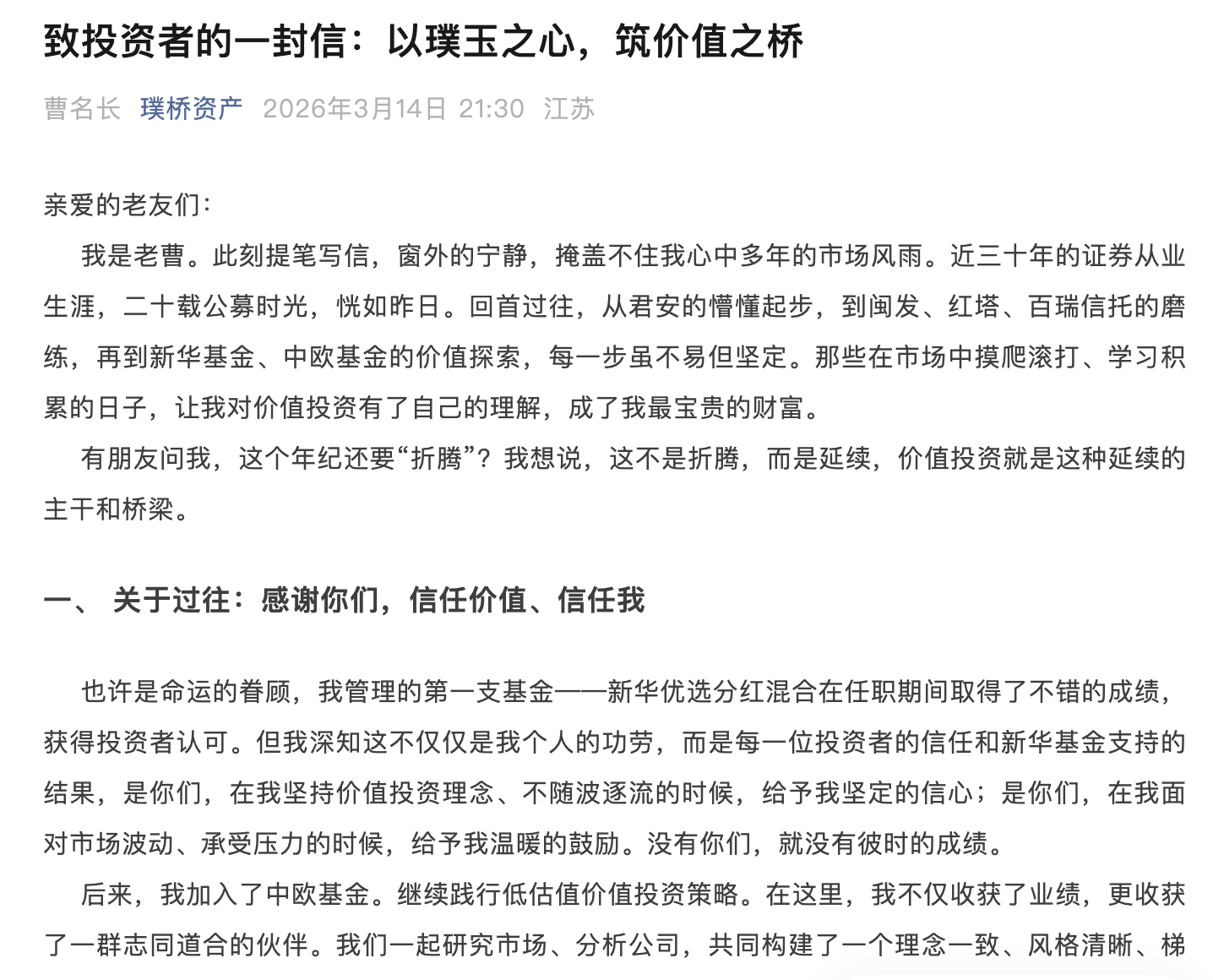 3月14日晚间,曹名长通过璞桥钞票微信号发布《致投资者的一封信:以璞玉之心,筑价值之桥》,并将该文转发在了其个东说念主微信一又友圈,认真官宣“奔私”音信。