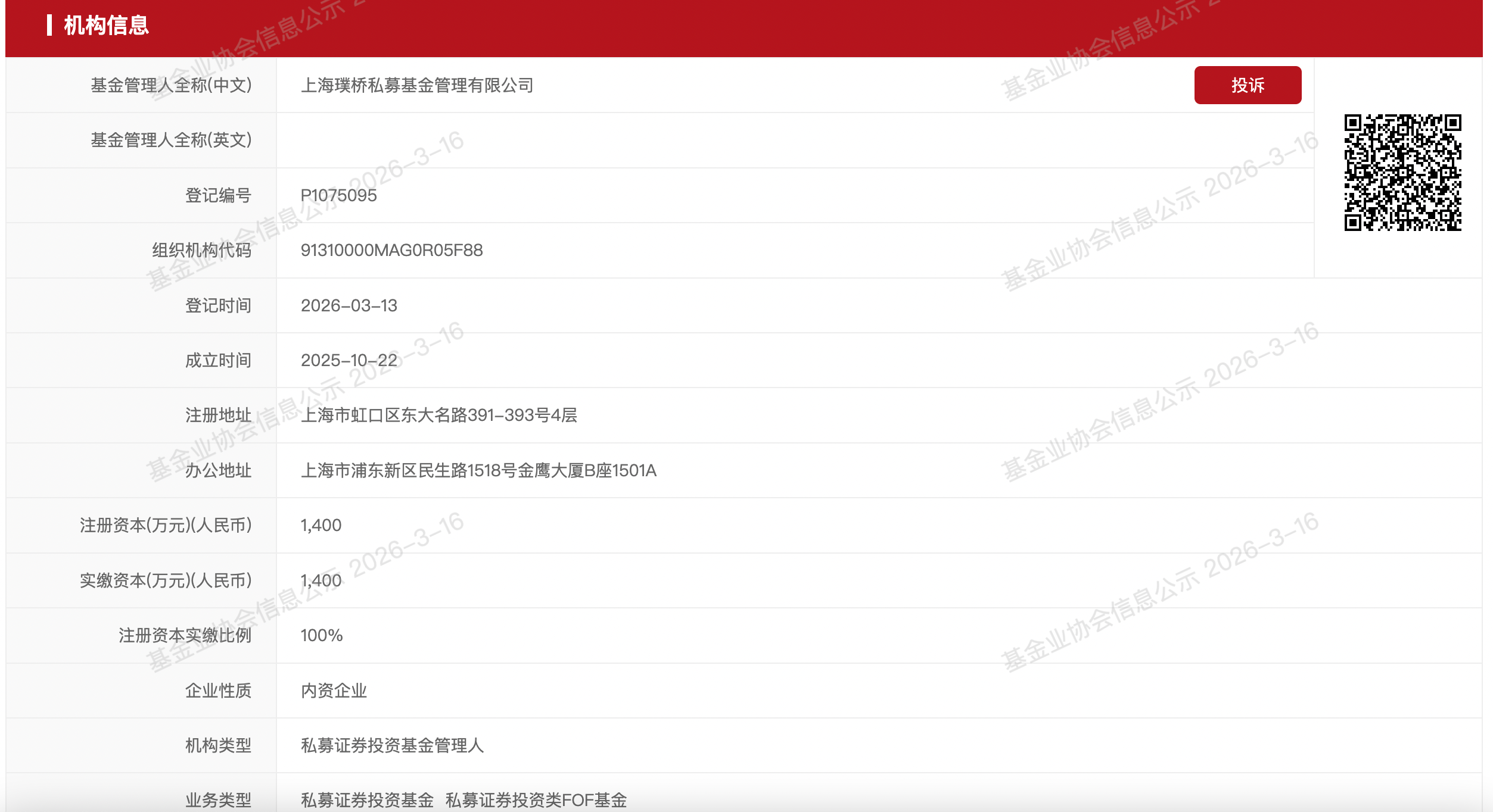 中基协网站透露,璞桥钞票成立于2025年10月,2026年3月13日完成登记。公司注册成本1400万元,现在全职职工7东说念主,业务类型包括私募证券投资基金和私募证券投资类FOF基金。出资东说念主方面,曹名长认缴比例为74%,是公司第一大推动。