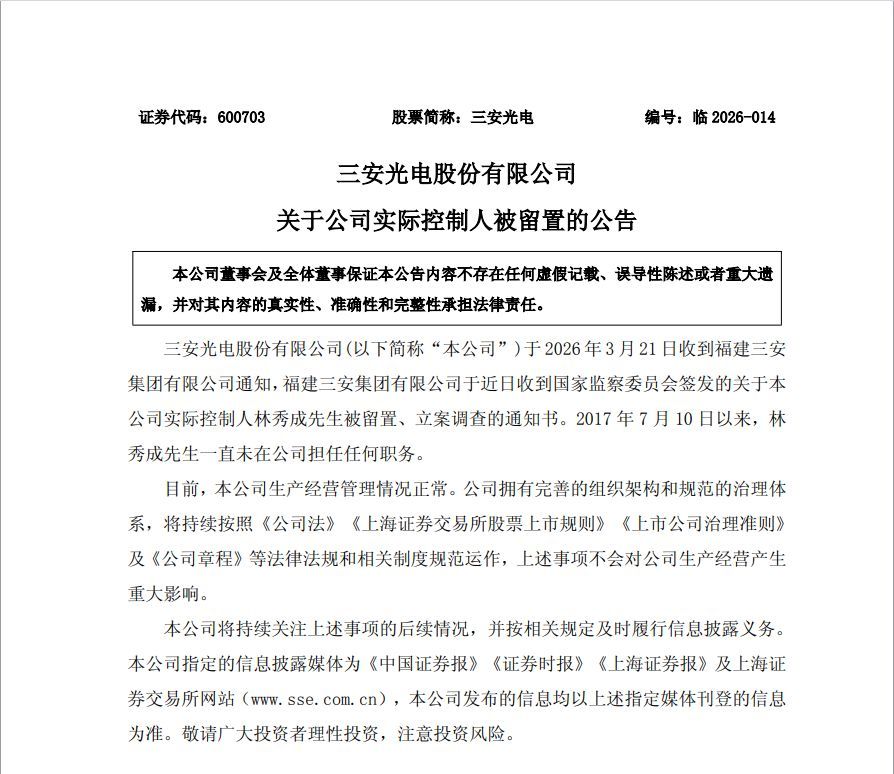 三安光电称,其于2026年3月21日收到福建三安集团有限公司(以下简称“三安集团”)见知,三安集团于近日收到国度监察委员会签发的对于本公司实质适度东说念主林秀成被留置、立案访问的见知书。
